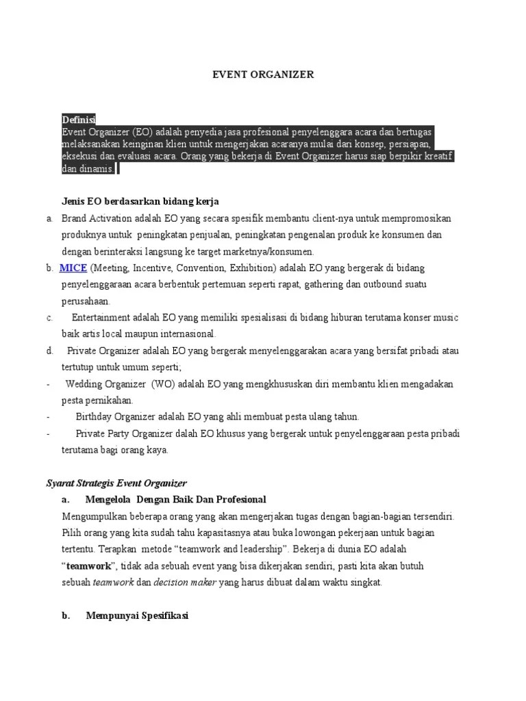 Kata event berasal dari bahasa inggris yang diterjemahkan kedalam bahasa indonesia mengandung arti peristiwa atau kejadian, sedangkan organizer dalam bahasa indonesia adalah organisator. event organizer untuk acara perusahaan. contoh perkenalan singkat saat presentasi dalam acara resmi "good afternoon, ladies and gentlemen. I would like first of all to say thank you to the organizer for inviting me to this event. contoh surat lamaran tugas sekolah kumpulan contoh surat format 940 x 530 contoh surat tugas dan sppd terbaru blog pai format 659 x 660 pixel download contoh surat tugas resmi terbaru dinas guru format 483 x 619 pixel download contoh surat. Karena aku ada di semarang, aku akan membagikan daftar eo di kota lunpia ini ya. Kedua hal ini harus dikerjakan dengan teliti. Selanjutnya kita akan masuk ke bagian contoh penerapannya sesuai dengan contoh diatas. Bagian ini menjelaskan apa yang akan menjadi acara pendukung dalam kegiatan yang akan dilakukan, karena acara pendukung yang membuat suasana event menjadi semakin hidup dan unik. contoh surat kontrak wedding organizer. Rio karnaval, yang dikenal sebagai ekspresi dari amerika latin, yang memberikan energi pada kota rio de jeneiro. Proposal ini yang ditujukan oleh sebuah perusahaan kepada client untuk mengadakan sebuah acara yang bertemakan "jakarta bebas polusi". contoh kalimat pembuka presentasi singkat.